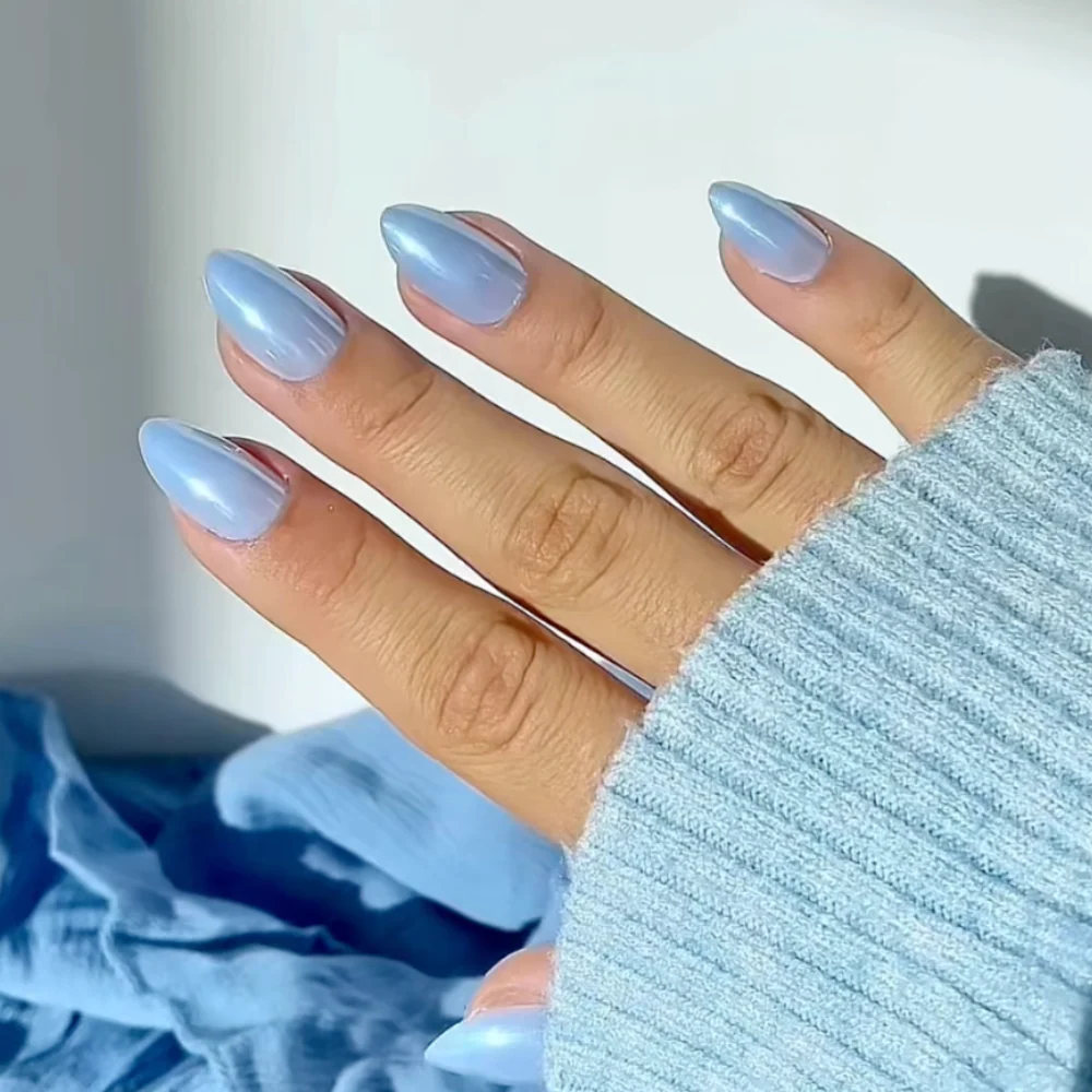 Frozen-Glass Blue nails look like icy ornaments, slightly translucent with a soft shimmering blue glow. We ALL know Hailey Bieber’s 2025 “glaze” era and this look blends her signature glossy sheen with a frosty holiday twist.