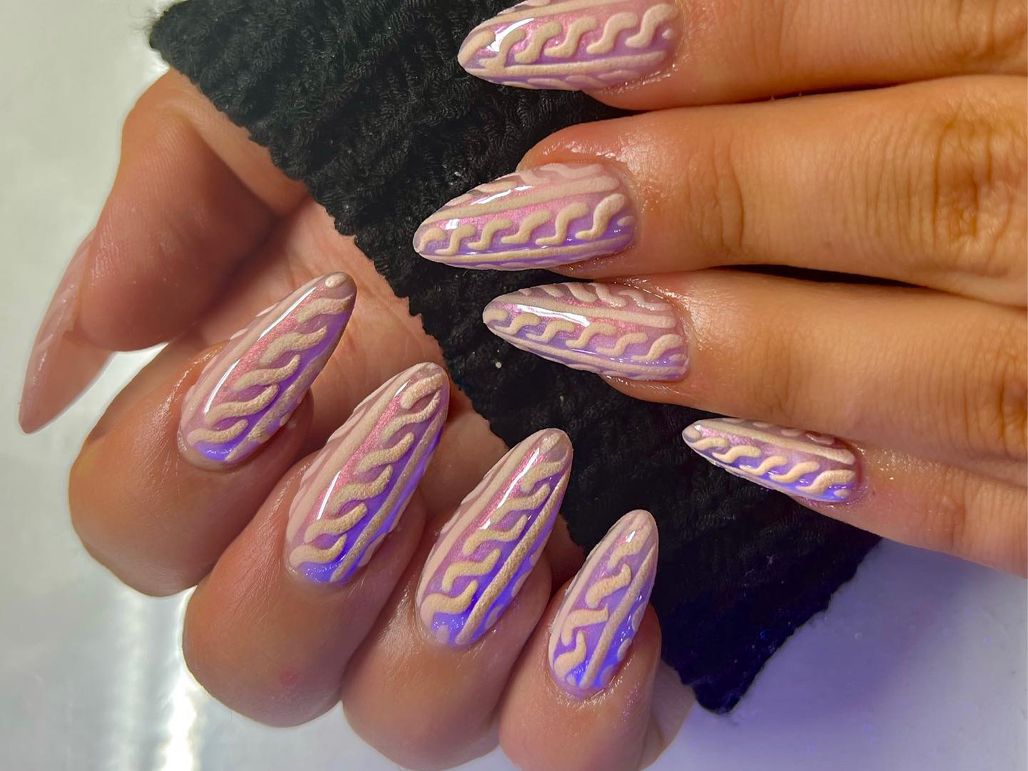 Sweater nails aren’t new, but the 2025 update uses thinner, micro-textured patterns for a more subtle effect.